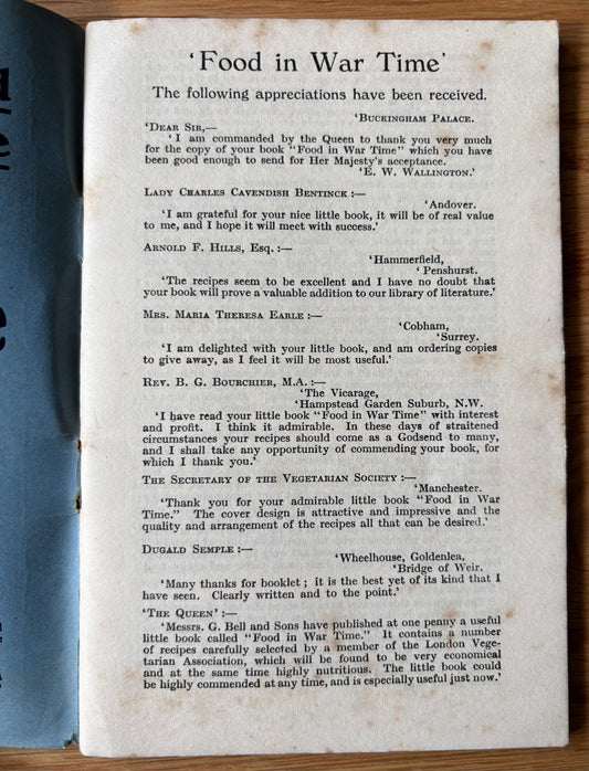 Scarce FOOD IN WAR TIME Vegetarian Cookery Book 5th Ed BIRMINGHAM SCHOOL Recipes