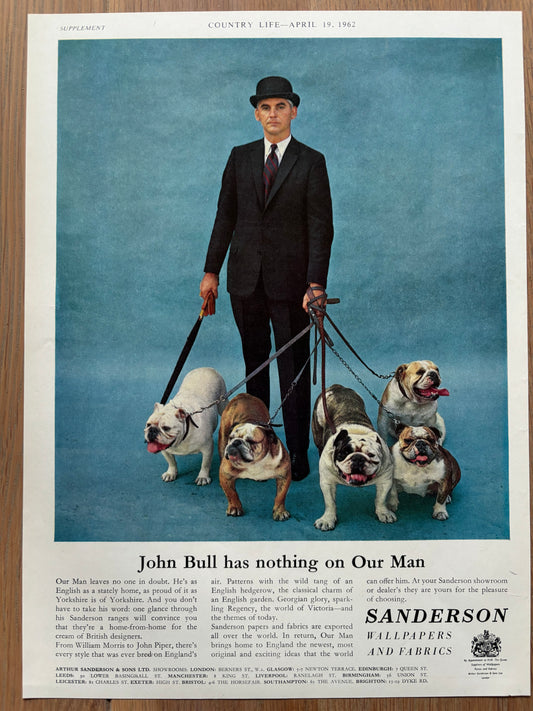 SANDERSON WALLPAPERS FABRICS Advert 1962 British Bulldog Bowler Hat